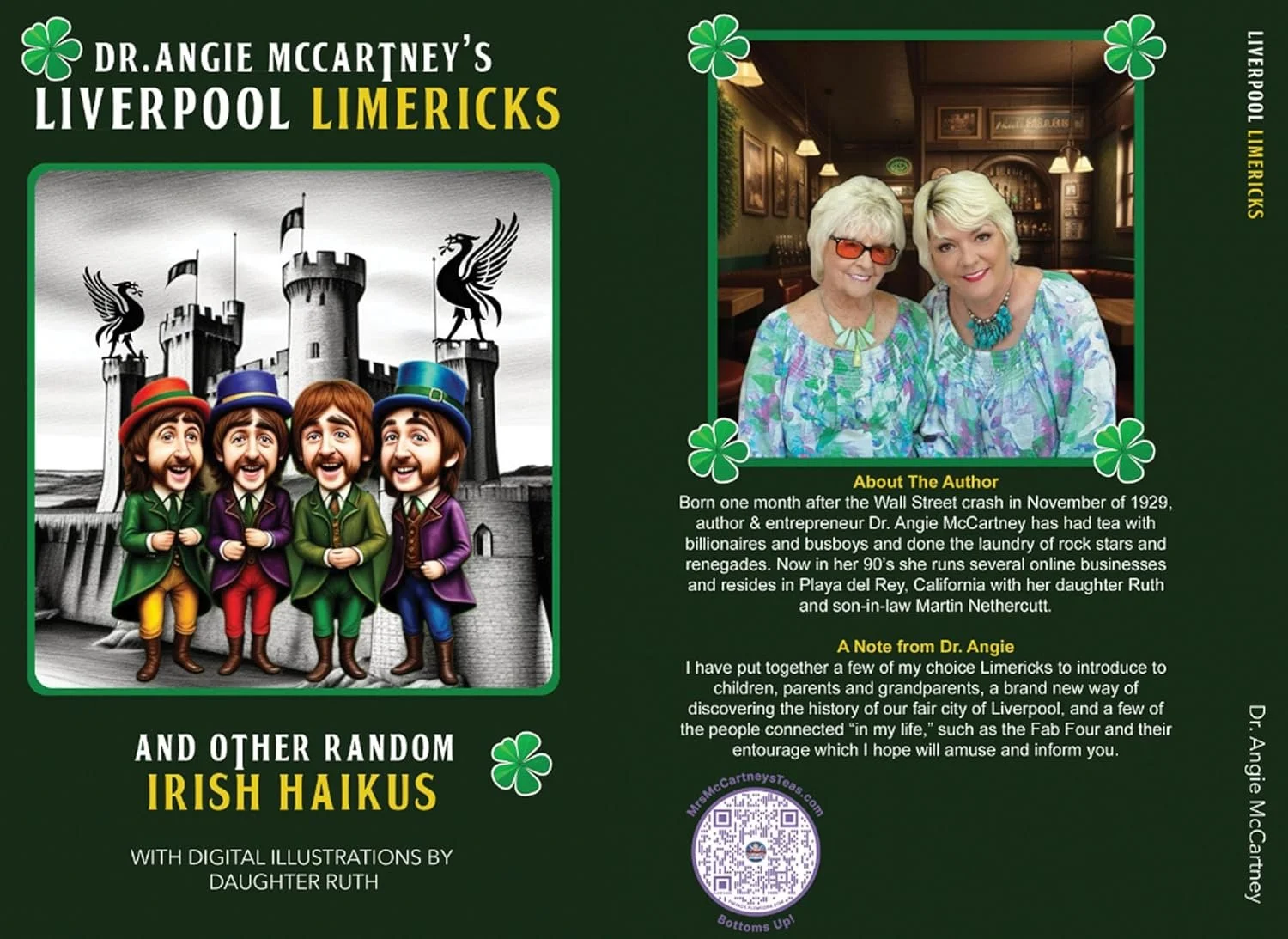 A lilting look at the Irish poetic format of the Limerick, featuring whimsical verse about icons of pop culture, the 1960's and iconic places in Liverpool, London and "across the universe." An ideal travel (or bathroom) companion for baby boomers, their grandkids and fans of the Fab Four. The book contains the history of the Limerick, and the story of Liverpool, the Fabs and their friends, QR code links to people, videos, destinations and other stops on this Magical Literary Tour. Penned by the witty nonagenarian Dr. Angie McCartney and digitally illustrated by her daughter - the Digital Diva - Ruth McCartney.